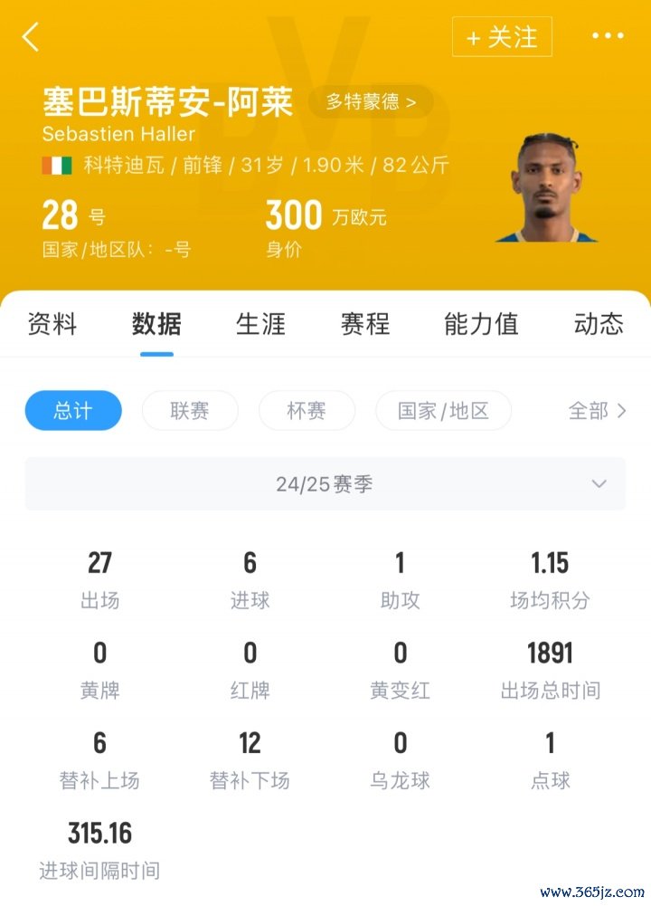 上赛季,阿莱为多特出场27场,取得了6粒得分 和1次助功 ,目前其德回转 价为300万欧。
