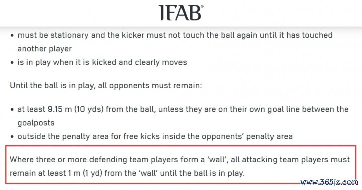 IFAB官方规则:当三名或三名以上防卫 队员组成“人墙”时欧冠决赛国米vs大巴黎,所有攻击 队员必须距离“人墙”至少1米,直至赛事 重新开始。