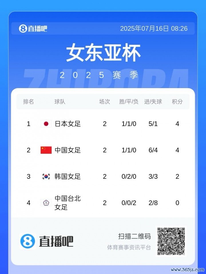 中国女足和日本女足目前均积4分,但因净胜球劣势,足球资讯日本女足暂居第1, 吹响体育集结号英超体育直播中国女足位列第2。