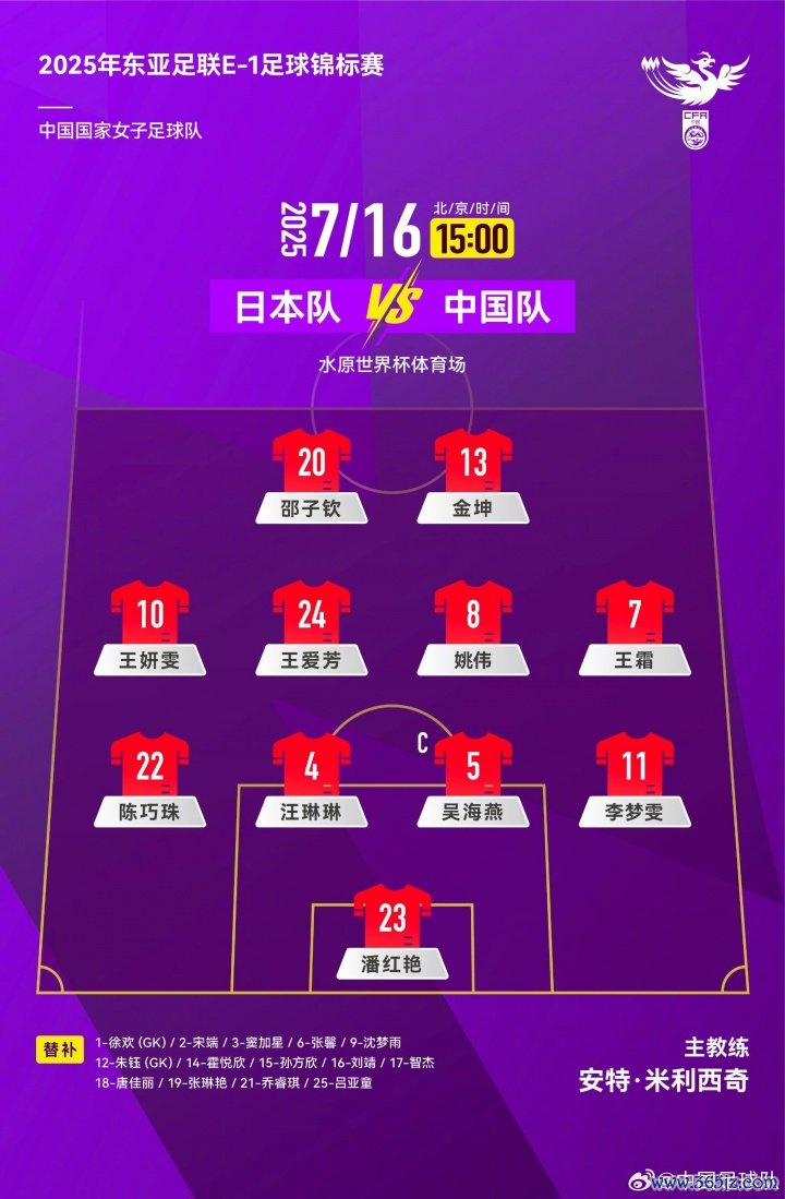 东亚杯丨中国女足vs日本女足杆位:王霜、吴海燕先发,李梦雯出战
