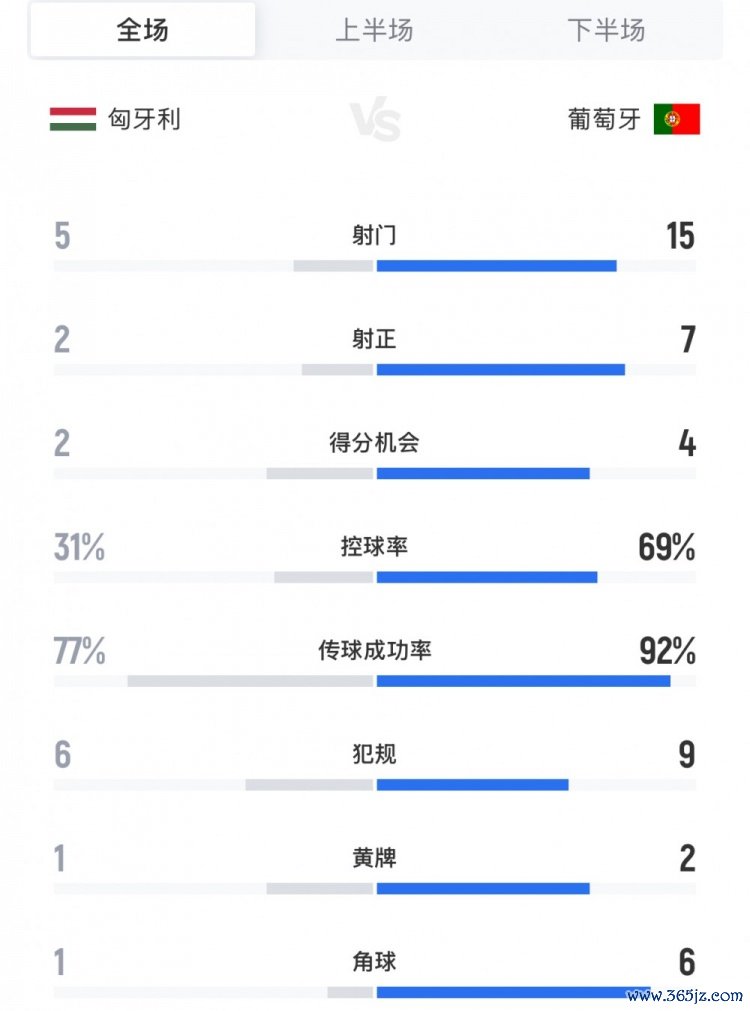 两队全场数据对比如下(主队匈牙利在前, 吹响体育集结号英超客队葡萄牙在后):