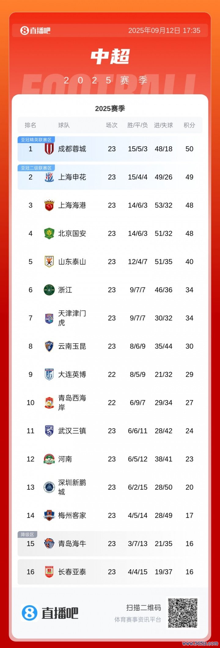 赛前积分方面,蓉城50分第一,身后申花、海港、国安的积分分别为49、48和48。