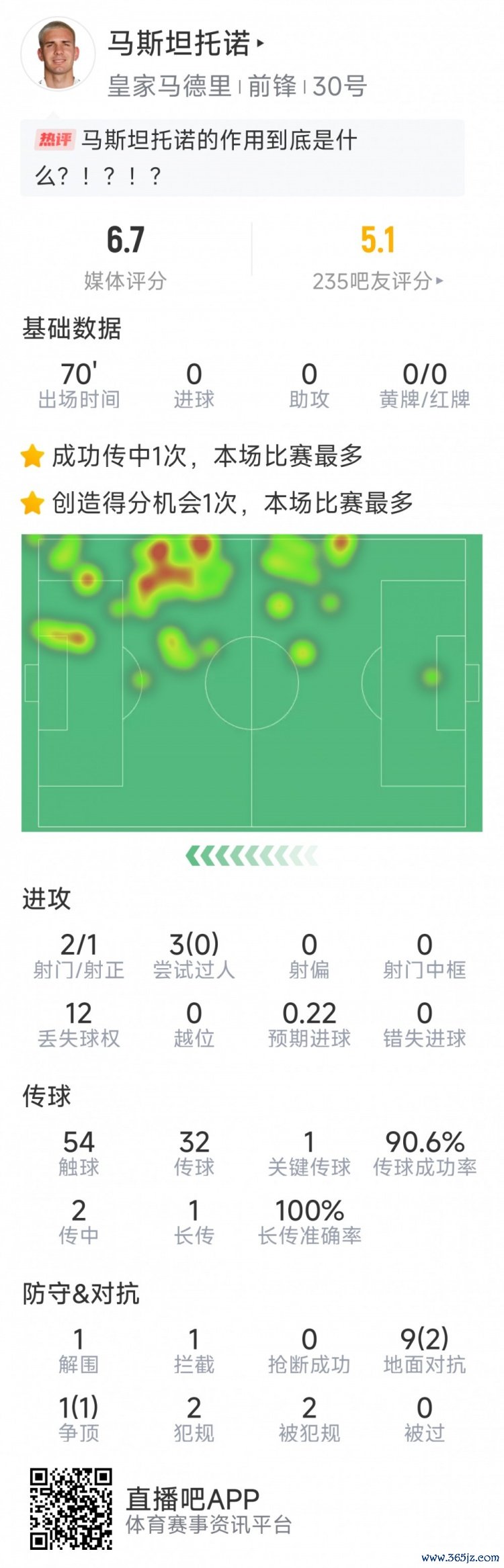 10月1日讯 在本轮欧冠, 吹响体育集结号英超NBA直播皇马5-0大胜阿拉木图凯拉特。以下为马斯坦托诺本场数据: