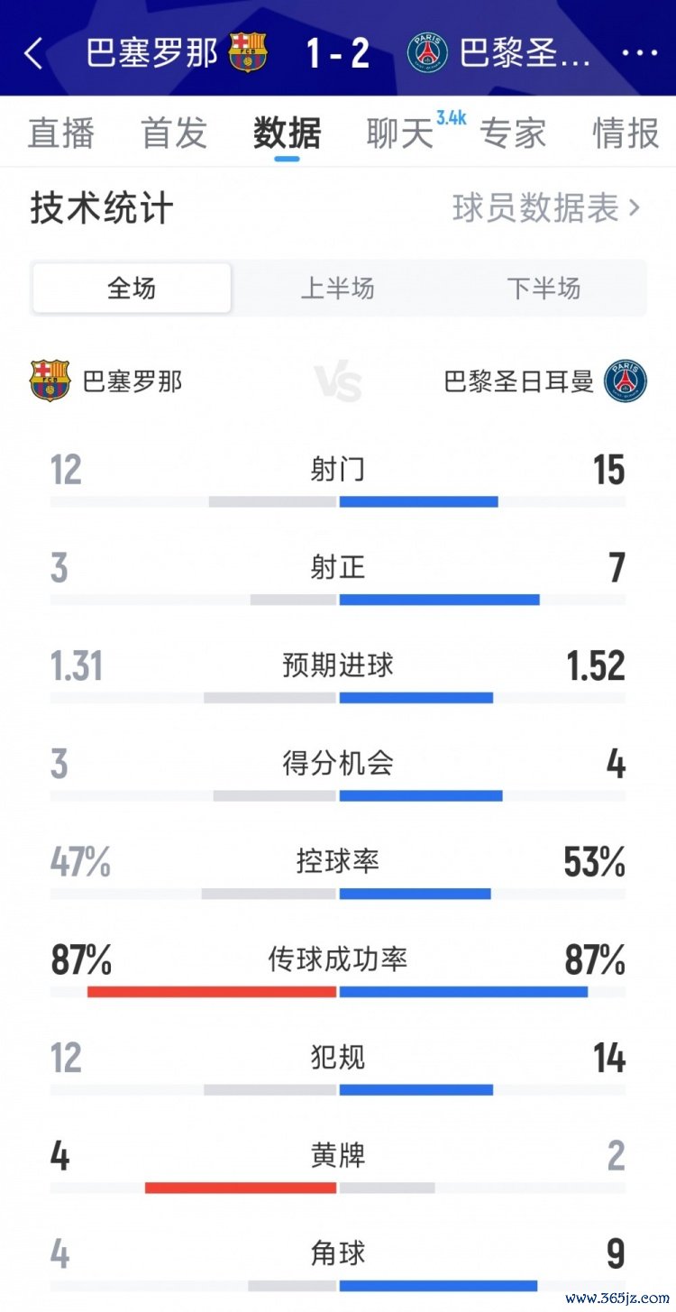 10月2日讯 在本轮欧冠,足球资讯直播吧巴黎2-1击败巴萨。以下为双方全场数据对比: