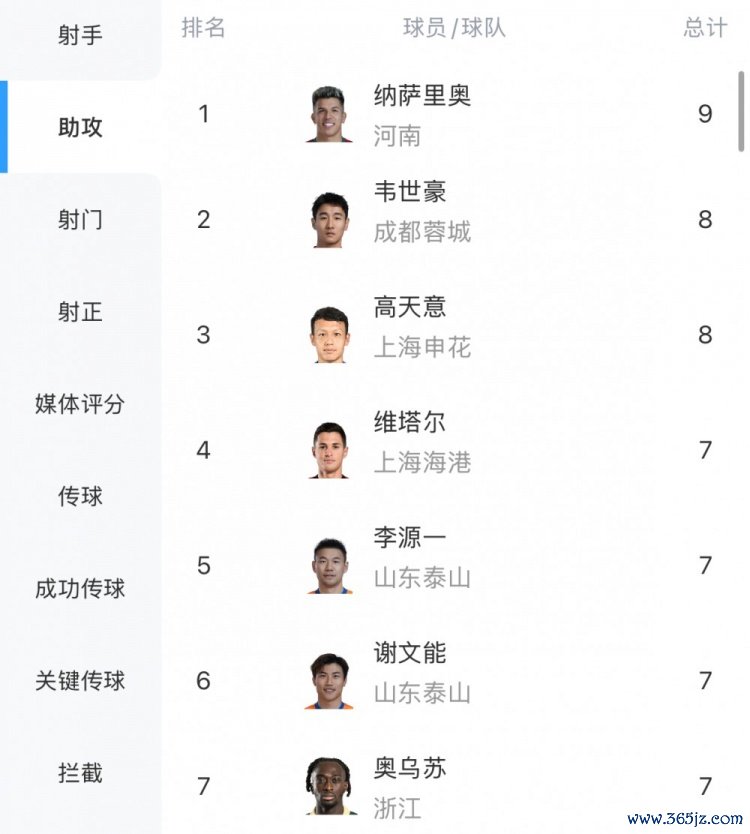 9月22日讯 中超第25轮昨晚结束,助功 榜方面, 吹响体育集结号英超足球直播本轮贡献一次助功 的河南队外援纳萨里奥9次登顶, 西甲韦世豪、高天意8次。