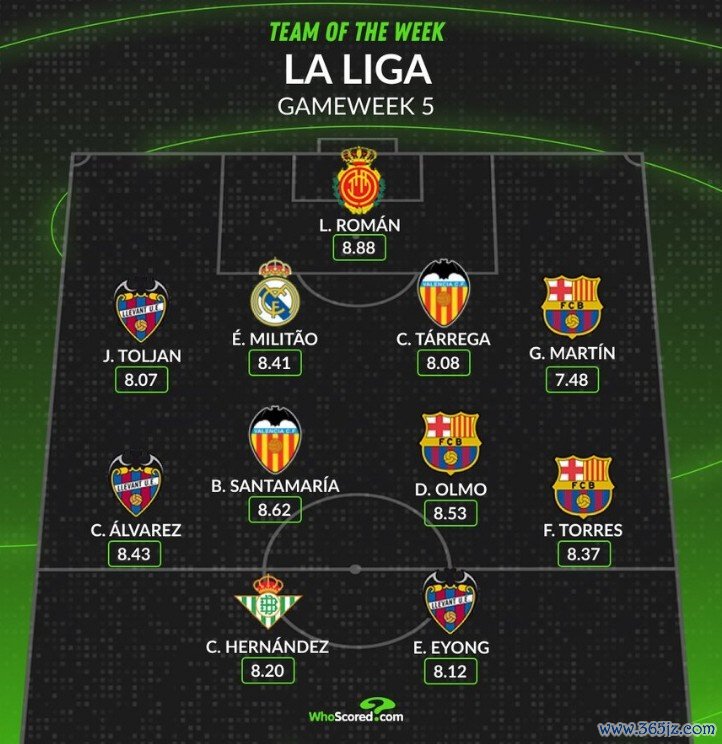 9月22日讯 西甲第五轮战罢,数据网站Whoscored也评选出本轮西甲最佳阵, 吹响体育集结号英超直播吧费兰等巴萨3人在列, 西甲米利唐如选。以下为具体阵形 :