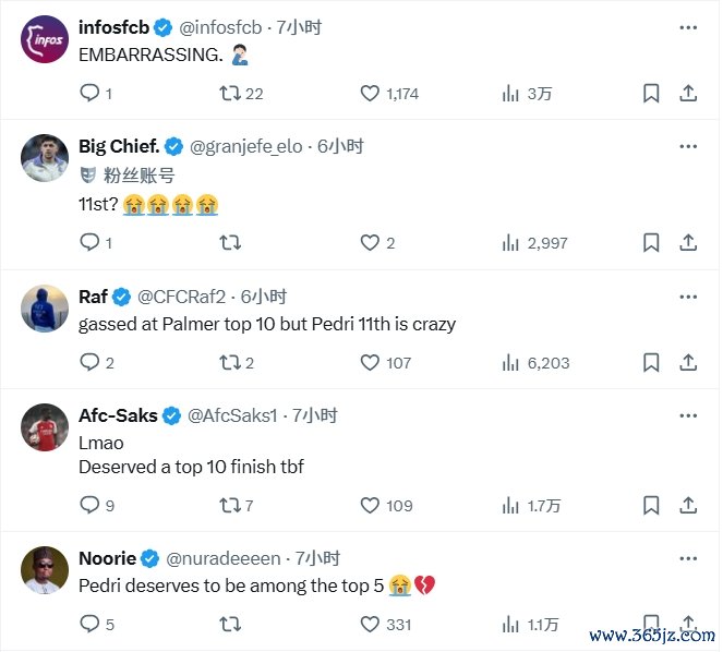 “帕尔默前十, 西甲而佩德里第十一名太疯狂了”