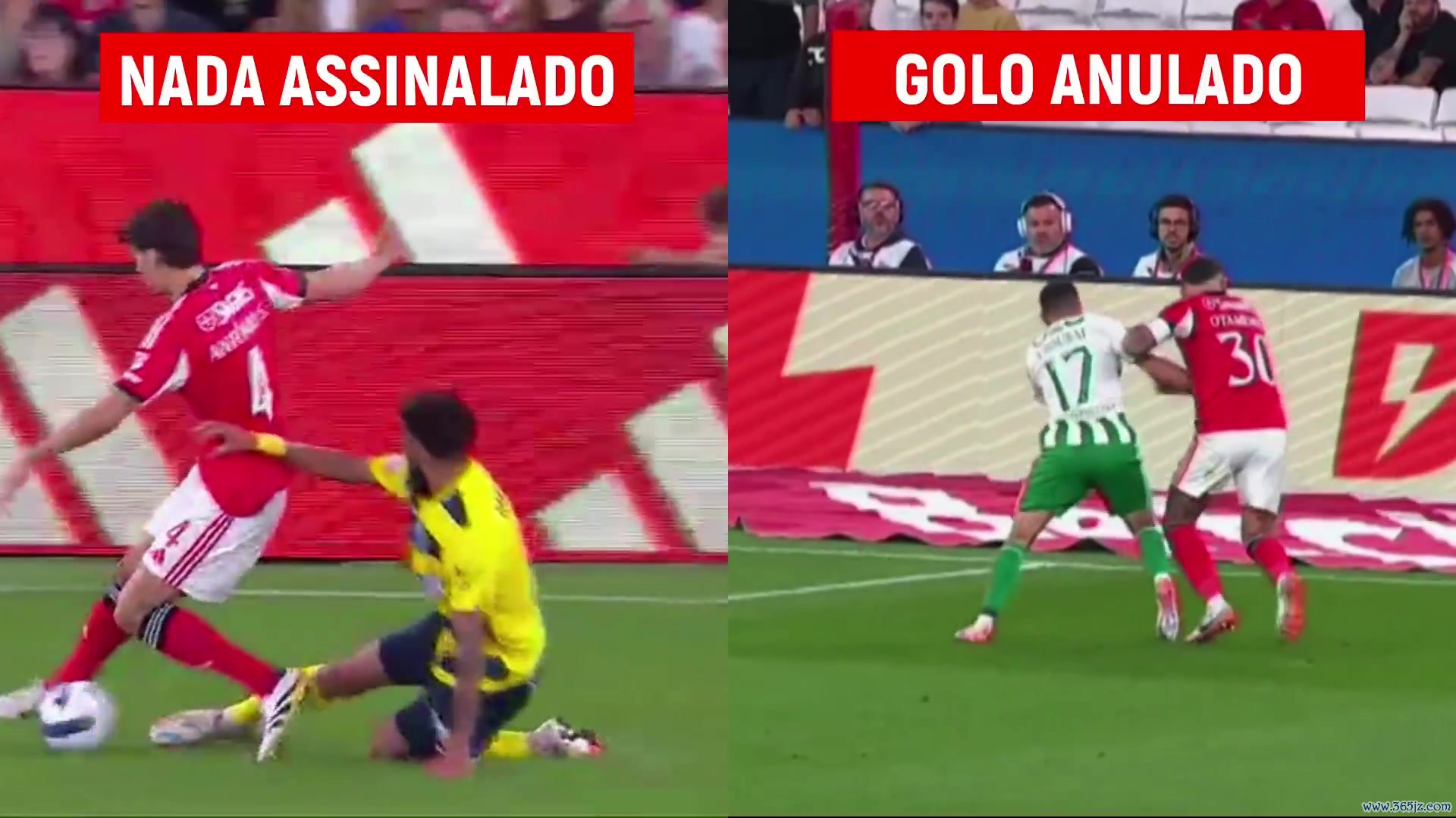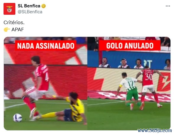 视频中,左边为本场赛事 本菲卡丢球前对手疑似对安东尼奥-席尔瓦违例 的瞬间,足球资讯配文“无事发生”, 吹响体育集结号英超右边为上场赛事 本菲卡得分 被吹前违例 的瞬间, 西甲英超直播配文“得分 无效”。本菲卡官推还配文:“(判决 )标准👉 APAF(葡萄牙裁判 协会)”