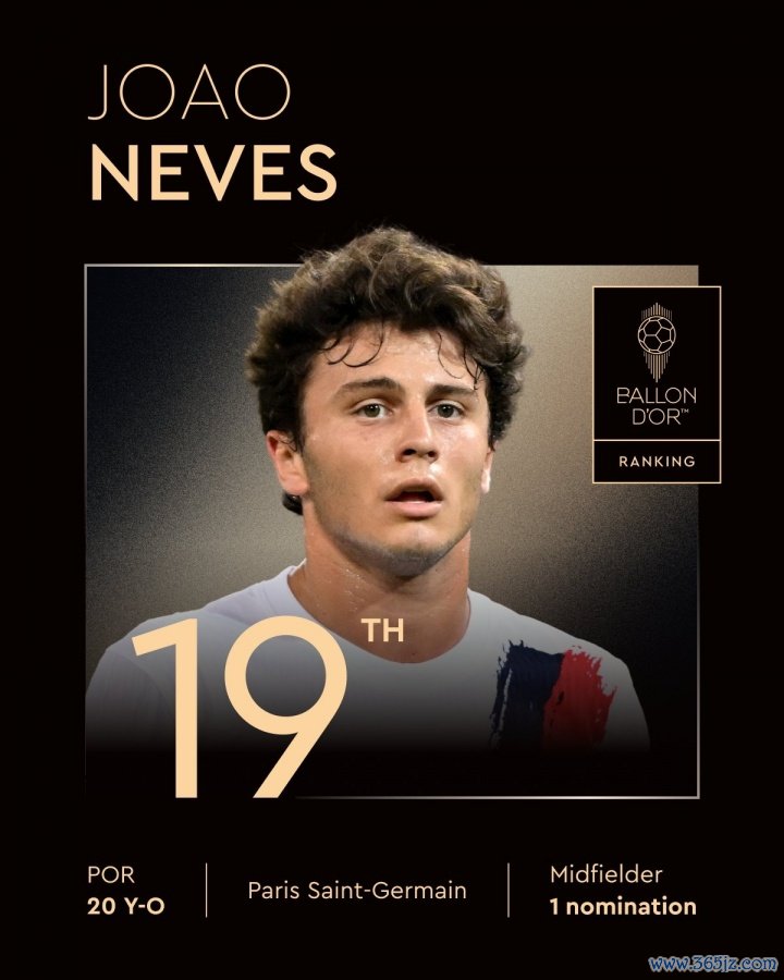 9月23日讯 2025年金球奖排名陆续公布,巴黎中场球员若奥-内维斯获得第19名,足球资讯生涯首次提名。