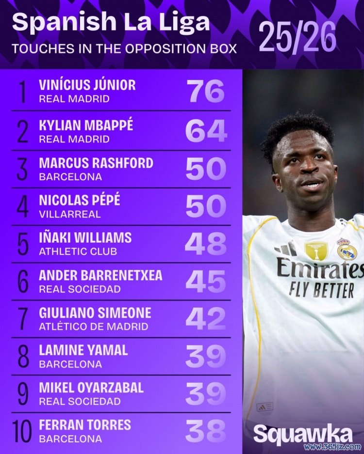 西甲危险区域 触球数排行:维尼修斯76次居首 姆巴佩第2、拉什福德第3