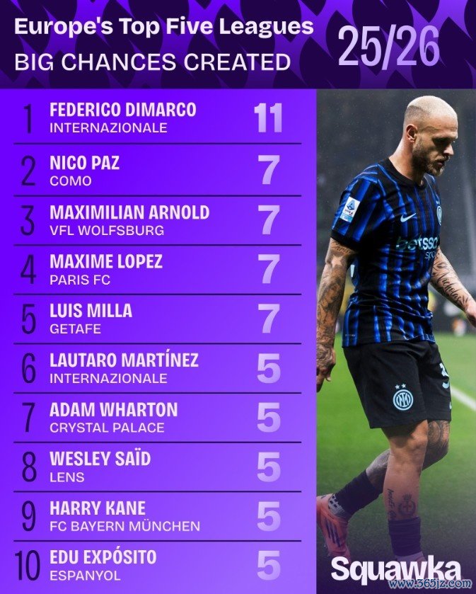 五大职业联赛 创造重大机会榜:迪马尔科11次居首,帕斯等4人均7次次之