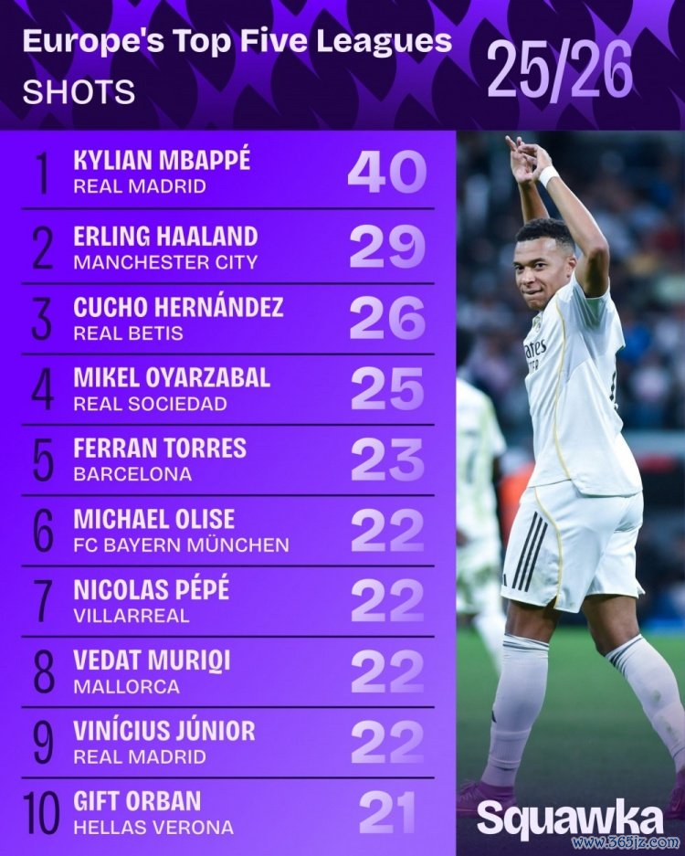五大职业联赛 球员本赛季射球 次数榜:姆巴佩40次第一,哈兰德29次第二