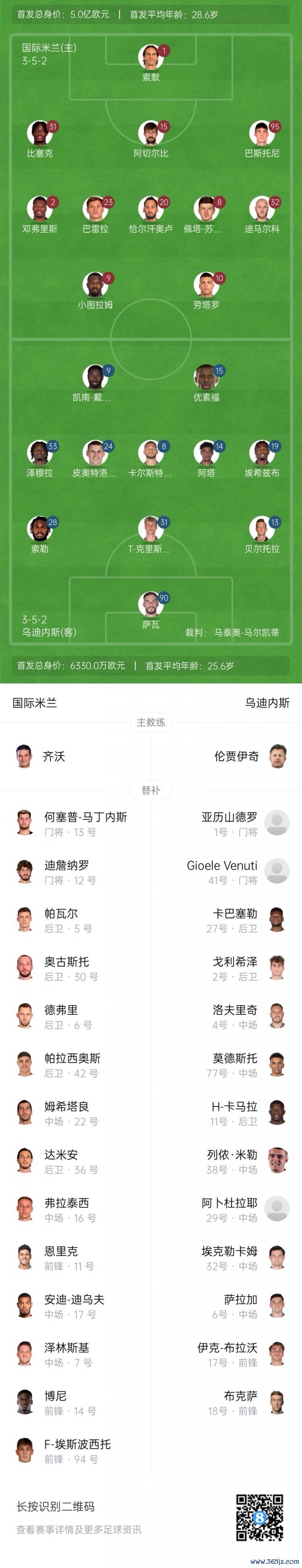 国米杆位:1-索默、31-比塞克、15-阿切尔比、95-巴斯托尼、2-邓弗里斯、23-巴雷拉、20-恰尔汗奥卢、8-佩塔-苏西奇、32-迪马尔科、9-小图拉姆、10-劳塔罗