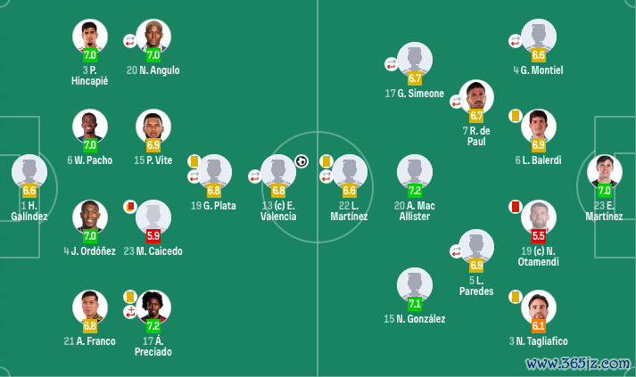 阿根廷杆位:23-达米安-马丁内斯、3-塔利亚菲科、19-奥塔门迪、6-巴列尔迪、4-蒙铁尔(68'16-莫利纳)、20-麦卡利斯特、5-帕雷德斯(63'10-马斯坦托诺)、7-德保罗(68'11-洛塞尔索)、15-尼古拉斯-冈萨雷斯、17-朱利亚诺-西蒙尼(38'2-福伊特)、22-劳塔罗(63'9-阿尔瓦雷斯)