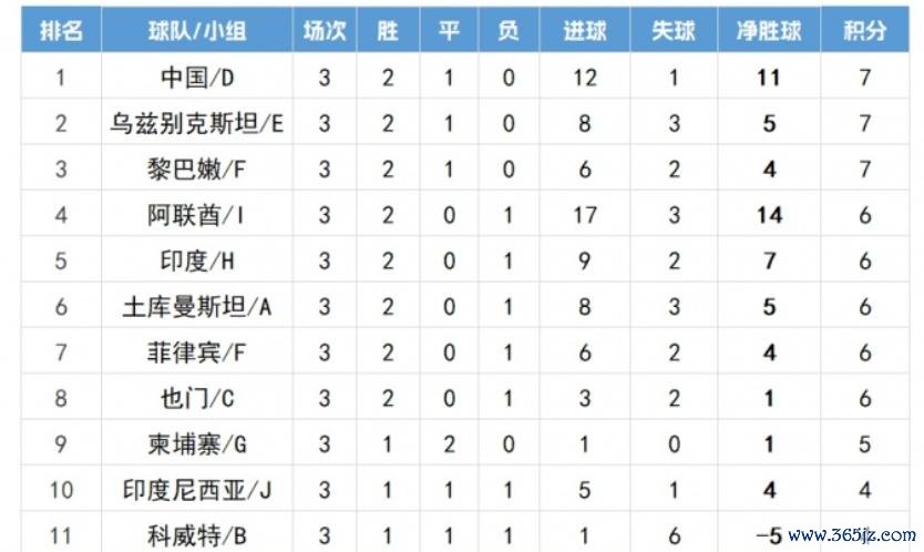 从以上积分榜来看, 吹响体育集结号英超中国队7分且11个净胜球, 西甲高居所有小组第二名的首位。其实,即便中国队小比分输给澳大利亚队,也能成为其中一个成绩最好的小组第二,足球直播拿到晋级下一轮 资格,因为只有2支积7分球队。