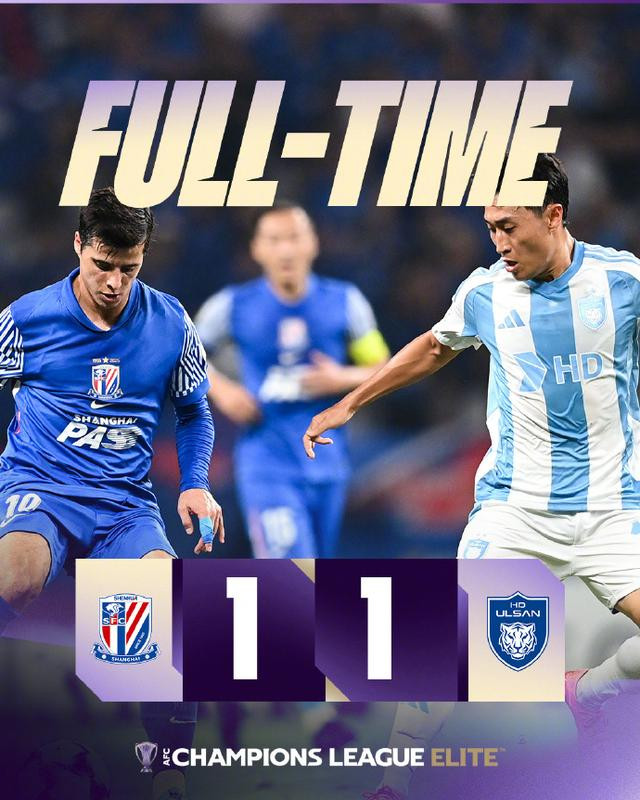上海申花本轮主场作战 1比1平蔚山HD队。