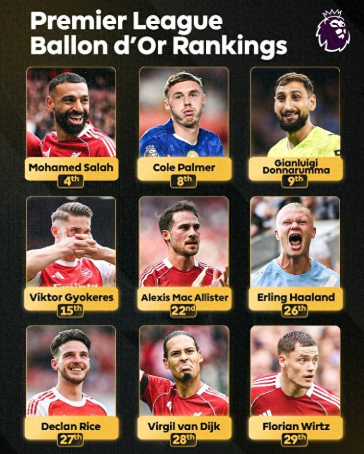 直播吧9月23日讯 2025年金球奖排名已经确定,前30中共9名目前在英超效力的球员,足球资讯体育直播英超官方晒出这些球员以及具体排名, 吹响体育集结号英超萨拉赫第4为英超球员最高。
