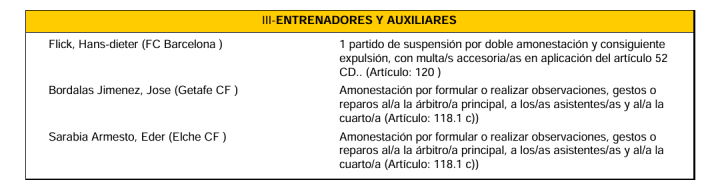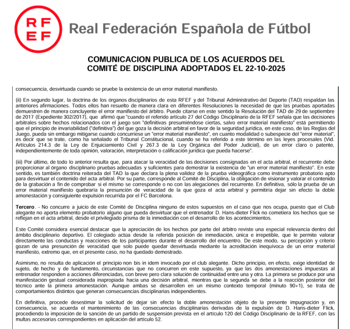 西班牙皇家足协纪律委员会在当地时间10月22日周三正午公布了西甲第9轮的判决 复核结果,其中对于巴萨主指导教练员汉斯-弗里克的驱逐 维持原判,按规定停赛一场外加罚款,无缘周末的国家德比。